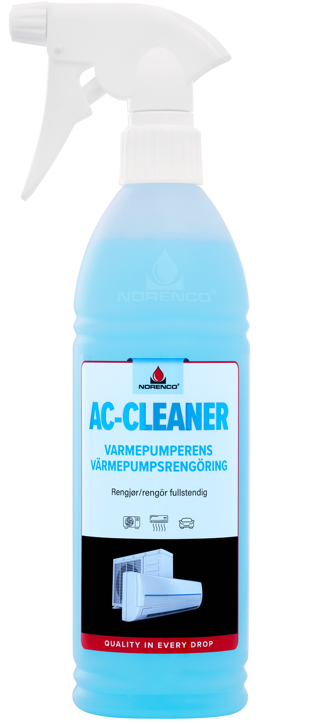 Legg en absorberende klut under varmepumpen for å unngå drypping. Spray på og la virke i 2 minutter. Tørk av med en myk klut. På dispay; spray direkte på kluten og tørk av. Spray inn i varme- og kjøleribber. Tørk av synlig væske. AC-Cleaner som sprayes inn i kjøleribbene, vil fordampe vekk av seg selv. Vent 1 time før varmepumpen startes opp igjen.