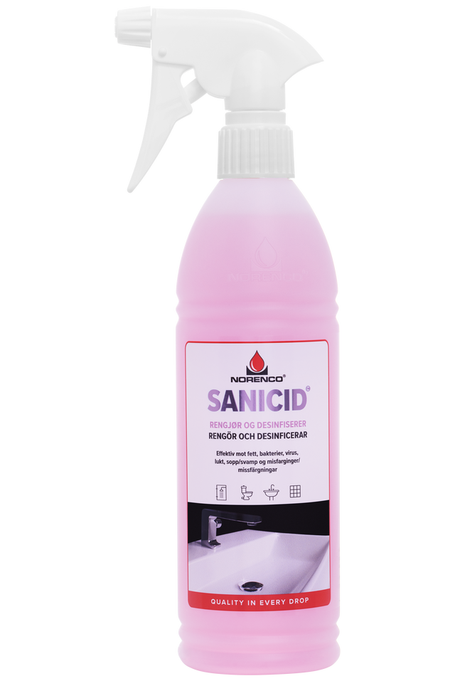 Sanicid er en universal rengjøringsspray for bad. Den egner seg utmerket til rengjøring og desinfisering av dusj, badekar, servanter, toalett, vegg og gulvfliser i våtrom.