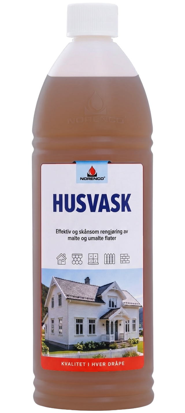 Til rengjøring av malte og umalte flater. HUSVASK er tilsatt sopp- og algefjerner. Kan tørke uten å skade glass og malte flater.