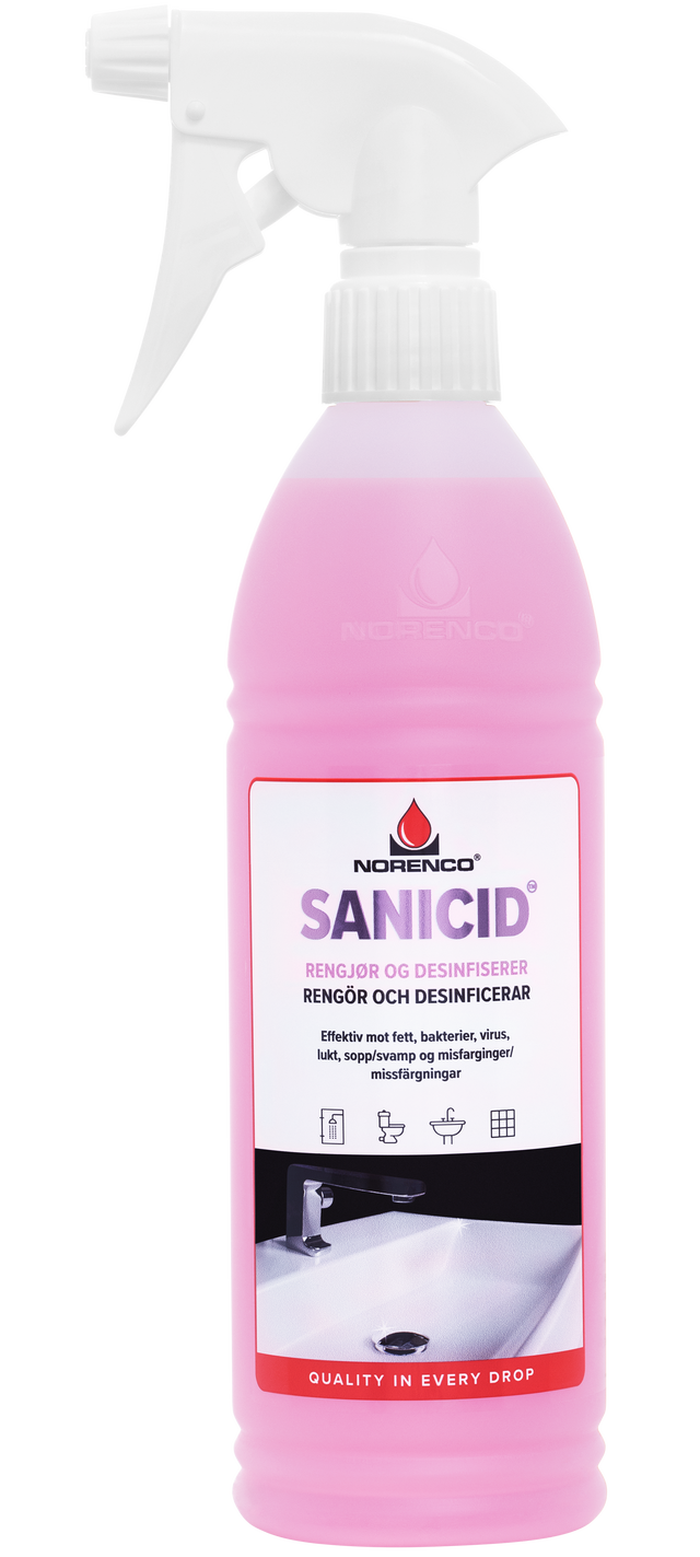 Sanicid er en universal rengjøringsspray for bad. Den egner seg utmerket til rengjøring og desinfisering av dusj, badekar, servanter, toalett, vegg og gulvfliser i våtrom.